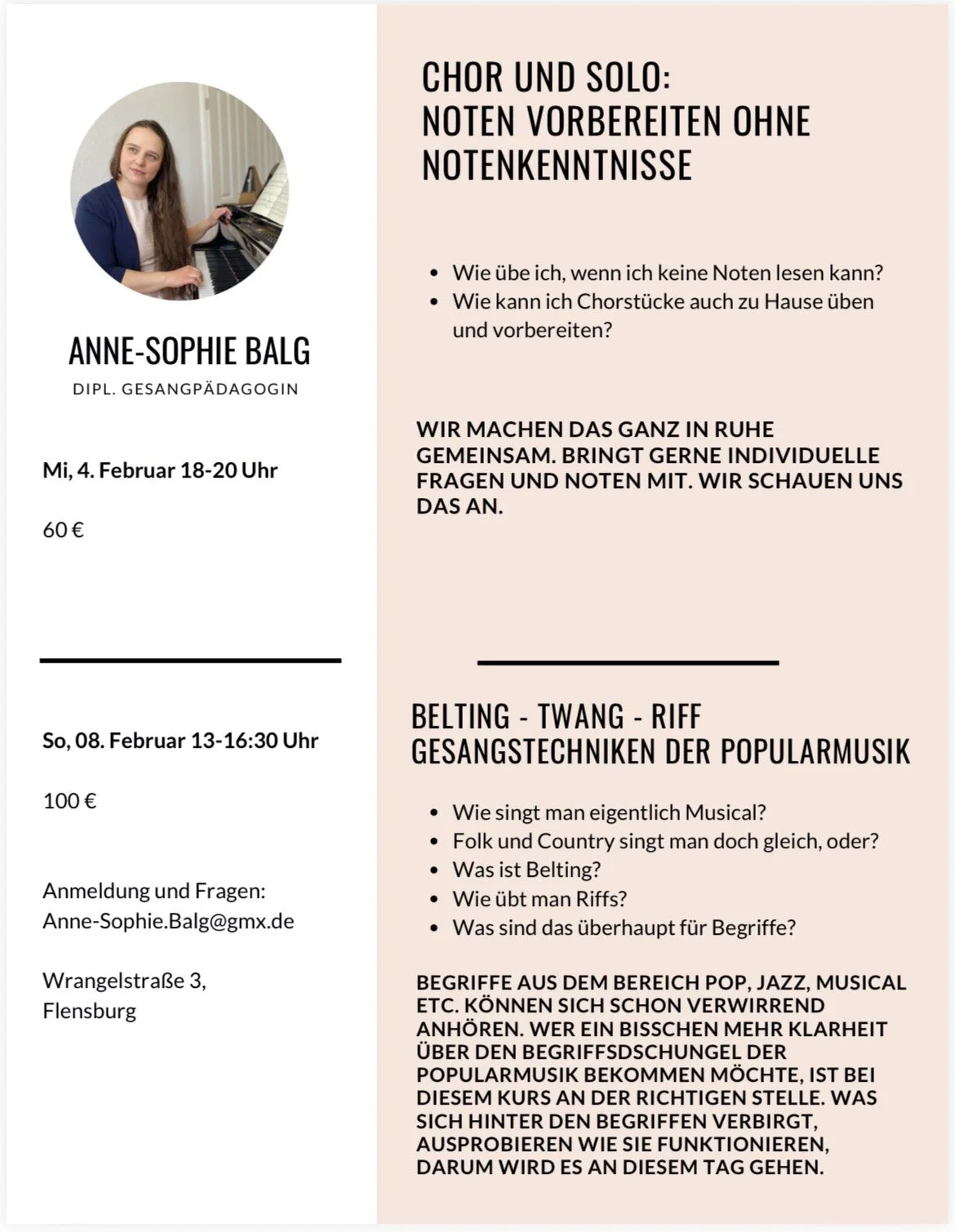 Die Stimme, den Körper und den Atem entdecken, Selbstbewusstsein aufbauen, Musik machen, etwas über Komponisten und Stile lernen, sich ausprobieren von barocker Verzierungpraxis über Arien, Kunstlieder bis hin zu Pop Song, Musical, Moderner Musik und Improvisation - das alles kann Gesangunterricht sein.